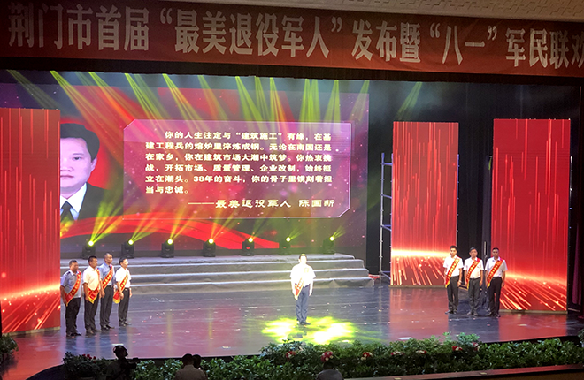 7月29日,“八一”建軍節(jié)前夕,荊門市首屆“最美退役軍人”發(fā)布儀式暨慶“八一”軍民聯(lián)歡演出在荊門劇院隆重舉行。此次全市“最美退役軍人”評(píng)選,經(jīng)網(wǎng)絡(luò)投票、意見(jiàn)征求和綜合審核等環(huán)節(jié)層層篩選,最終湖北荊門建工集團(tuán)有限公司陳國(guó)新等來(lái)自全市各自崗位的20名優(yōu)秀退役軍人脫穎而出榮獲“最美退役軍人”稱號(hào)。
