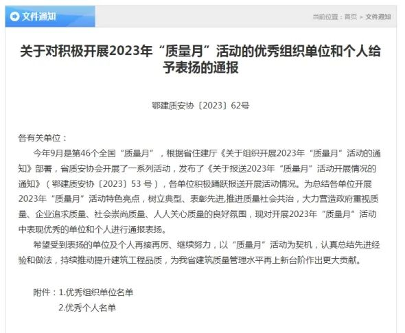 近日,湖北省建設工程質(zhì)量安全協(xié)會發(fā)布《關于對積極開展2023年質(zhì)量月活動優(yōu)秀組織單位和個人給予表揚的通報》,中房集團荊門公司所屬金茂建設公司位列其中,獲評“優(yōu)秀組織單位”,該公司郭家松、王建軍、徐爽三名同志榮獲“優(yōu)秀個人”。