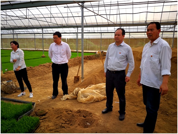 圖為城控集團(tuán)黨委書(shū)記、董事長(zhǎng)杜佐鵬同志(右二)到蔣集村育秧基地實(shí)地察看