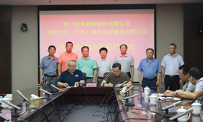 簽約儀式上,豐金亮與景德鎮(zhèn)市名鎮(zhèn)天下陶瓷文化創(chuàng)意有限責任公司董事長歐陽琦簽訂了《戰(zhàn)略合作協(xié)議》;荊門俊豐鋼構股份有限公司董事長葉東與泊鷺北方(寧夏)通用航空服務有限公司董事長徐晨陽簽訂了《合作協(xié)議》。