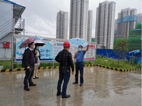 在項(xiàng)目工地出入口,楊維元首先查看了體溫檢測(cè)、實(shí)名登記情況,然后到生活區(qū)域、辦公場(chǎng)所查看了環(huán)境消殺、疫情物資配備及封閉管理情況,最后聽取了龍山中央商務(wù)區(qū)項(xiàng)目概況及施工進(jìn)度匯報(bào),詳細(xì)了解了項(xiàng)目防疫物資保障、工程疫情防控情況。隨后,楊維元對(duì)項(xiàng)目疫情防控工作表示了肯定。