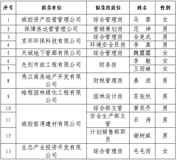 市城控集團2021年度員工招聘擬錄用人員公示公告