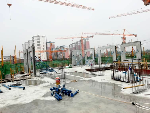 第一批裝配式建筑預(yù)制構(gòu)件主要包括外墻、樓梯、陽臺、隔板等,總計(jì)約8900立方米。經(jīng)現(xiàn)場實(shí)測,一個小時可完成3片外墻構(gòu)件吊裝,每片外墻構(gòu)件5個平方米,1個立方米,約2噸半左右。4-5天可以完成一層裝配式建筑構(gòu)件安裝和現(xiàn)澆工作。采取裝配式建筑較傳統(tǒng)施工的工期將提升20-30%。